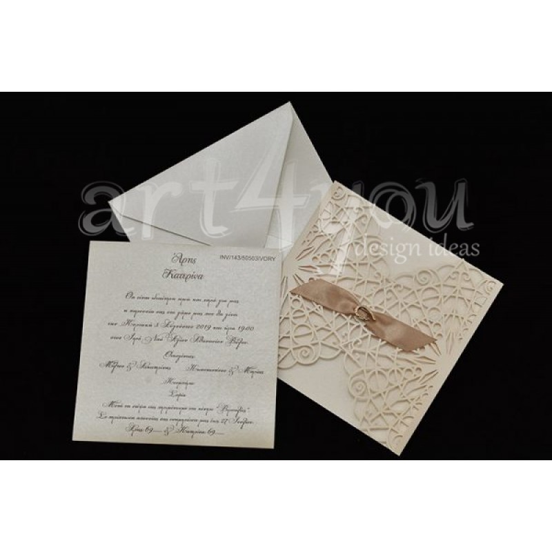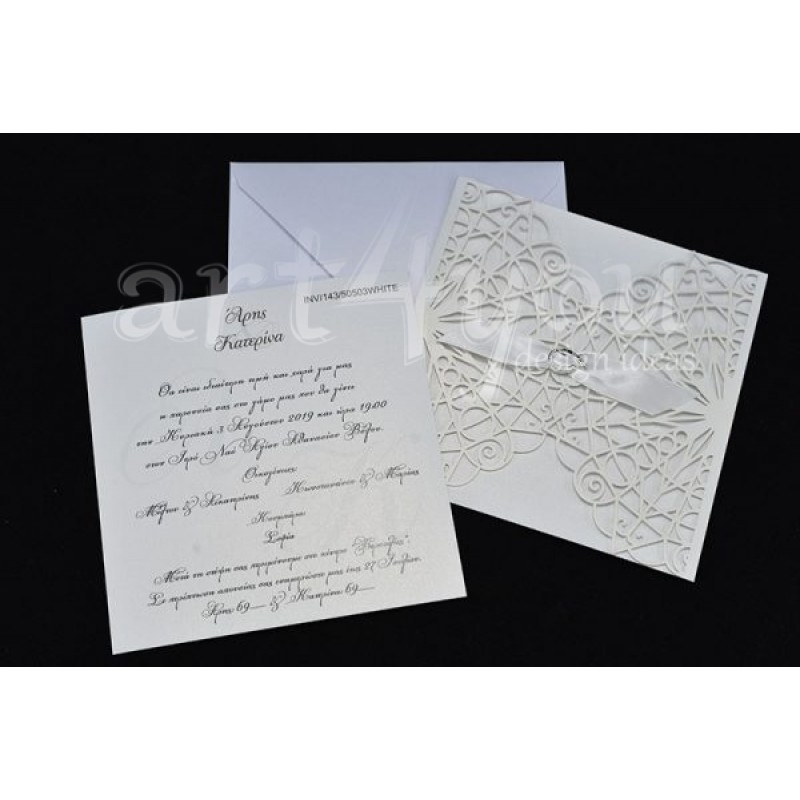 Το προσκλητήριο διαθέτει φάκελο διάστασης 16,5×16,5cm σε περλέ χαρτί