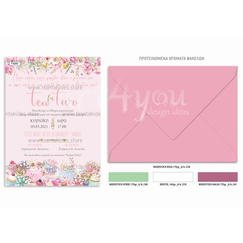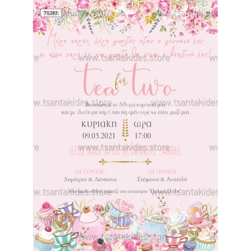 Προσκλητήριο βάπτισης για δίδυμα με θέμα shabby chic και teapot.