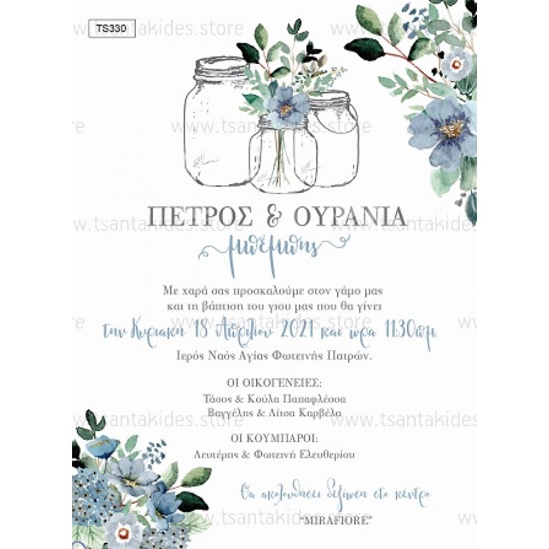Προσκλητήριο γάμου - βάπτισης με θέμα λουλούδια στα βαζάκια.