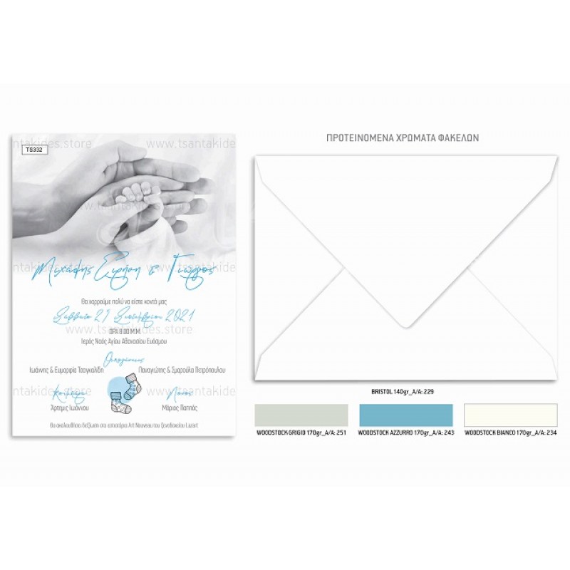 Το προσκλητήριο διαθέτει φάκελο διάστασης 19,5x14,5cm σε χαρτί της επιλογής σας από τους αναγραφόμενους κωδικούς.