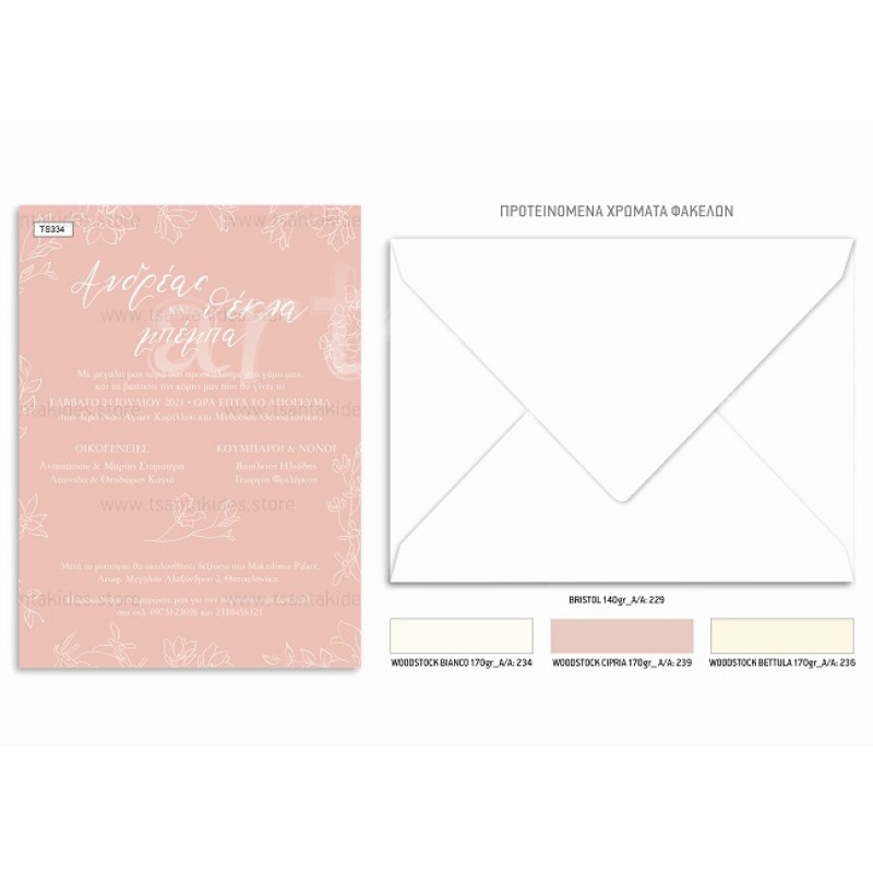 Το προσκλητήριο διαθέτει φάκελο διάστασης 19,5x14,5cm σε χαρτί της επιλογής σας από τους αναγραφόμενους κωδικούς.