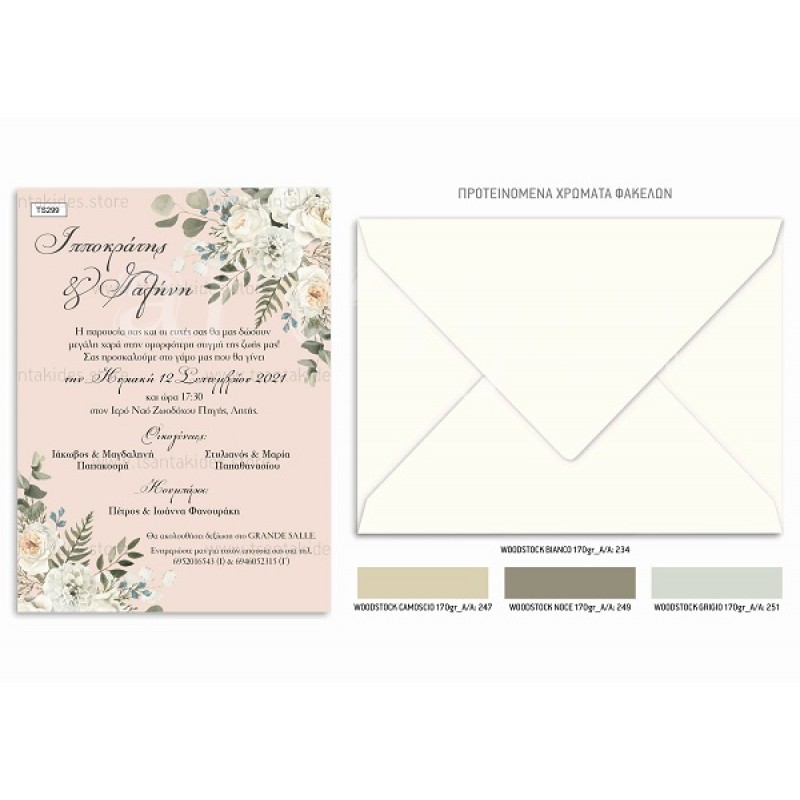 Το προσκλητήριο διαθέτει φάκελο διάστασης 19,5x14,5cm σε χαρτί της επιλογής σας από τους αναγραφόμενους κωδικούς.