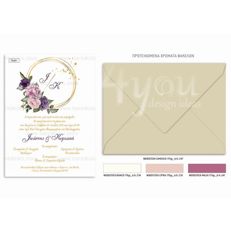 Το προσκλητήριο διαθέτει φάκελο διάστασης 19,5x14,5cm σε χαρτί της επιλογής σας από τους αναγραφόμενους κωδικούς.