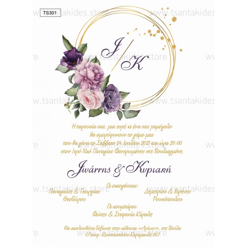 Προσκλητήριο γάμου με κυκλικό στεφανάκι, μοβ λουλούδια και χρυσές λεπτομέρειες
