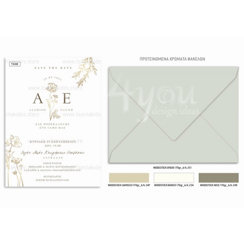 Το προσκλητήριο διαθέτει φάκελο διάστασης 19,5x14,5cm σε χαρτί της επιλογής σας από τους αναγραφόμενους κωδικούς.
