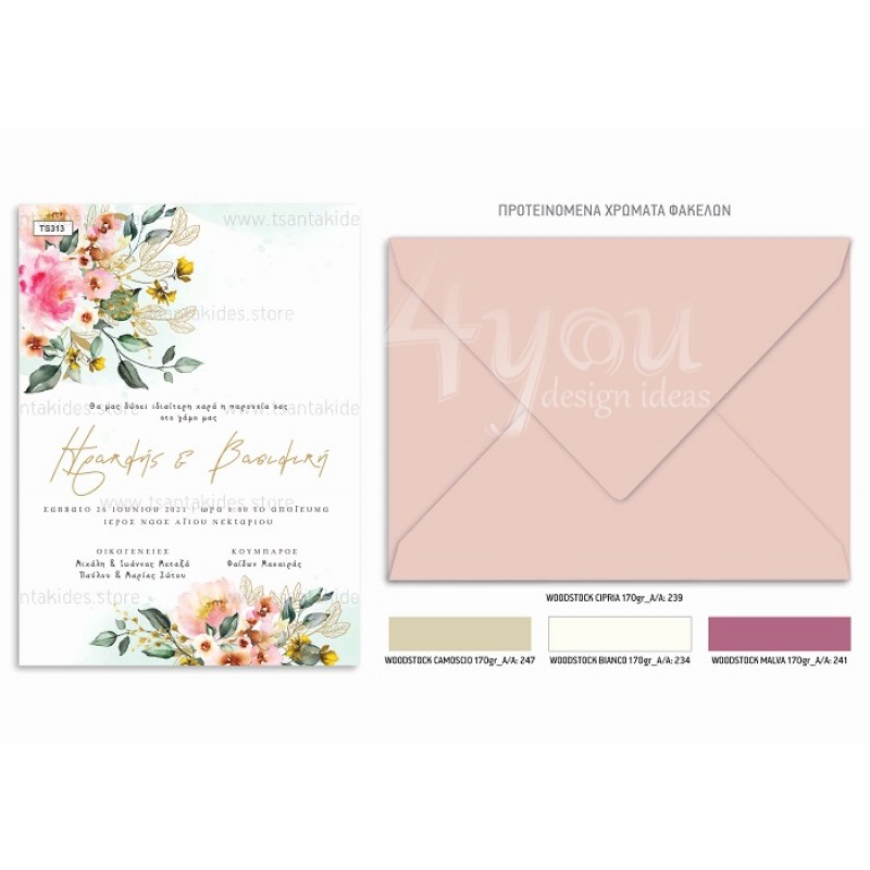 Το προσκλητήριο διαθέτει φάκελο διάστασης 19,5x14,5cm σε χαρτί της επιλογής σας από τους αναγραφόμενους κωδικούς.
