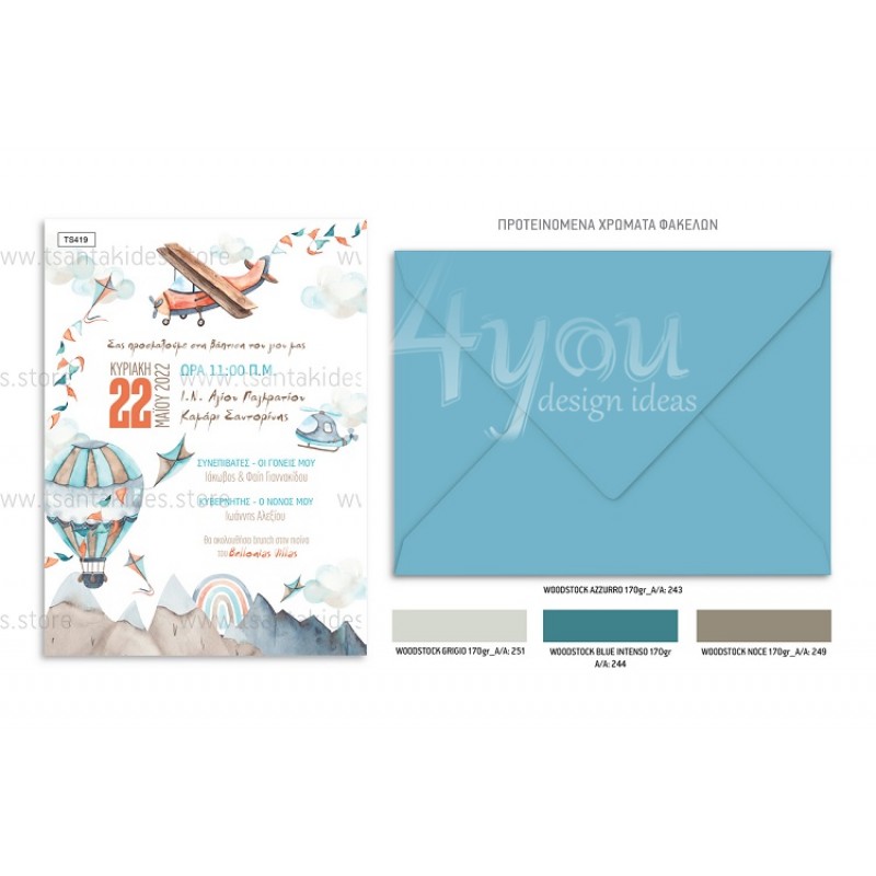 Το προσκλητήριο διαθέτει φάκελο διάστασης 19,5x14,5cm σε χαρτί της επιλογής σας από τους αναγραφόμενους κωδικούς.