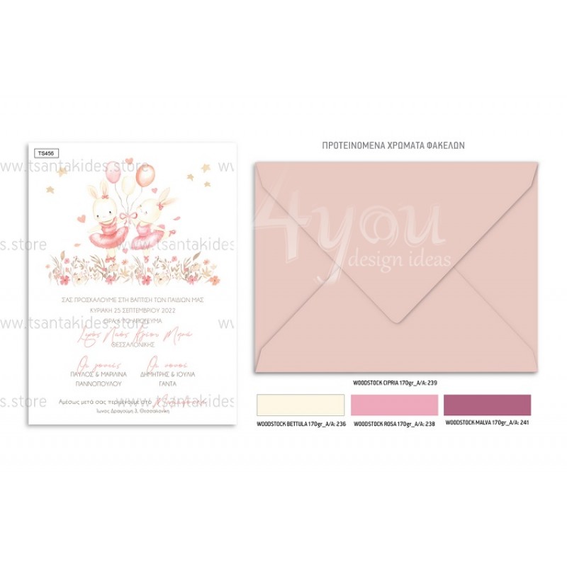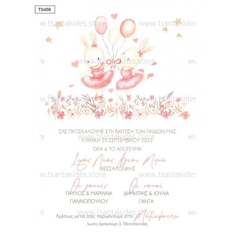 Προσκλητήριο βάπτισης για δίδυμα με θέμα Ballarinas Bunnies