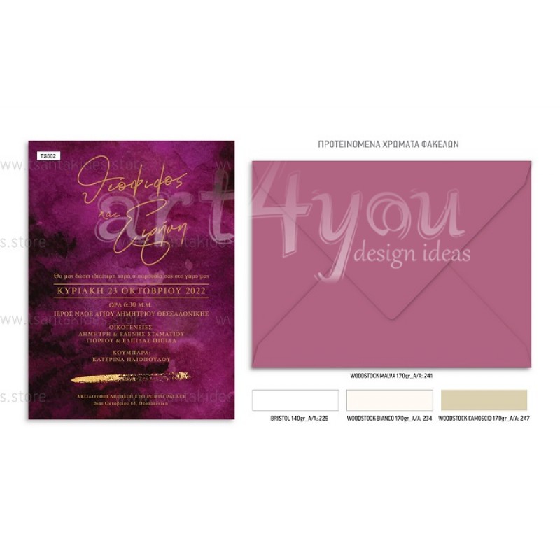 Το προσκλητήριο διαθέτει φάκελο διάστασης 19,5x14,5cm σε χαρτί της επιλογής σας από τους αναγραφόμενους κωδικούς.