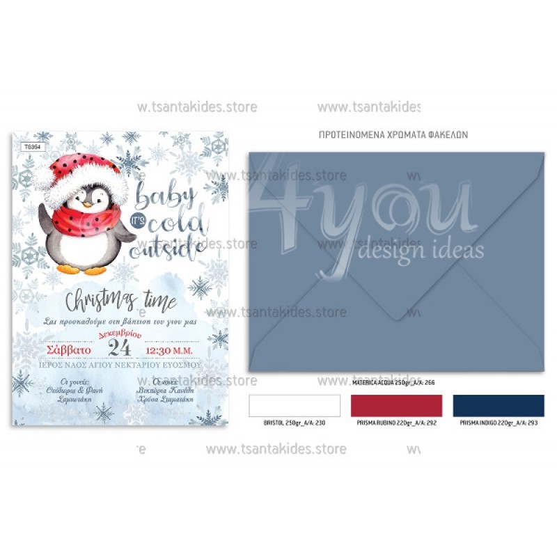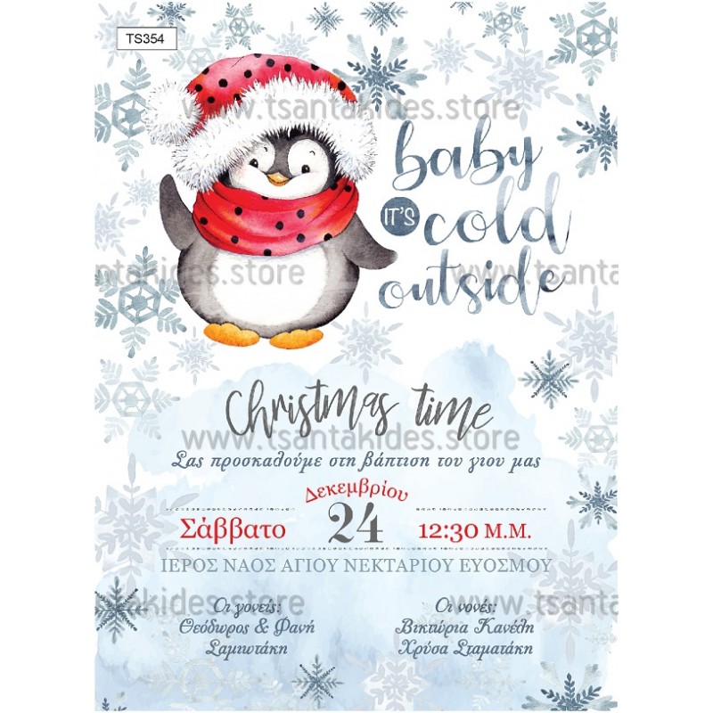 Προσκλητήριο βάπτισης με θέμα Penguin Cute Winter