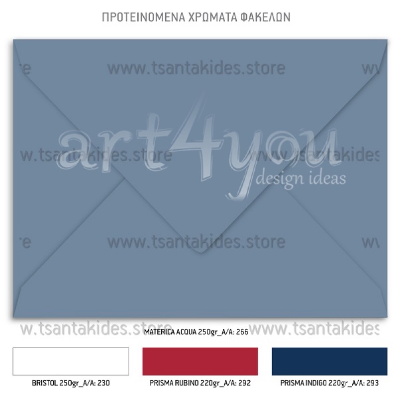 Το προσκλητήριο διαθέτει φάκελο διάστασης 19,5x14,5cm σε χαρτί της επιλογής σας από τους αναγραφόμενους κωδικούς.