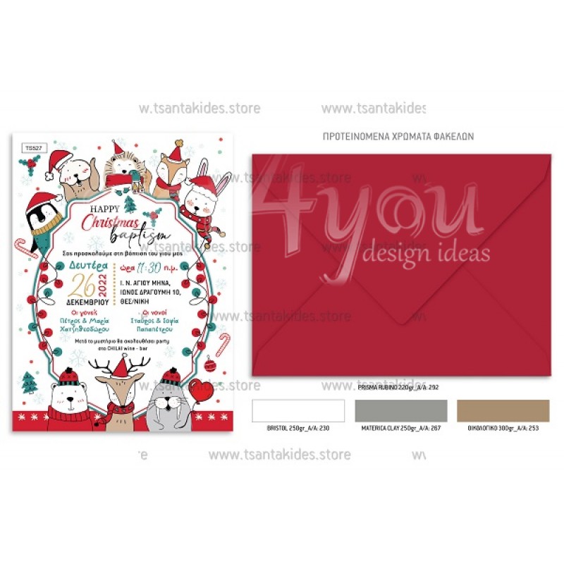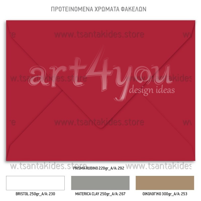 Το προσκλητήριο διαθέτει φάκελο διάστασης 19,5x14,5cm σε χαρτί της επιλογής σας από τους αναγραφόμενους κωδικούς.