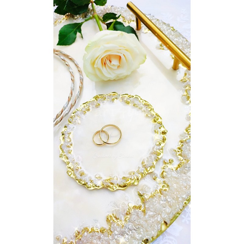 Στρόγγυλος γαμήλιος δίσκος μαζί με σουβέρ για τις βέρες σας στο ίδιο χρώμα.