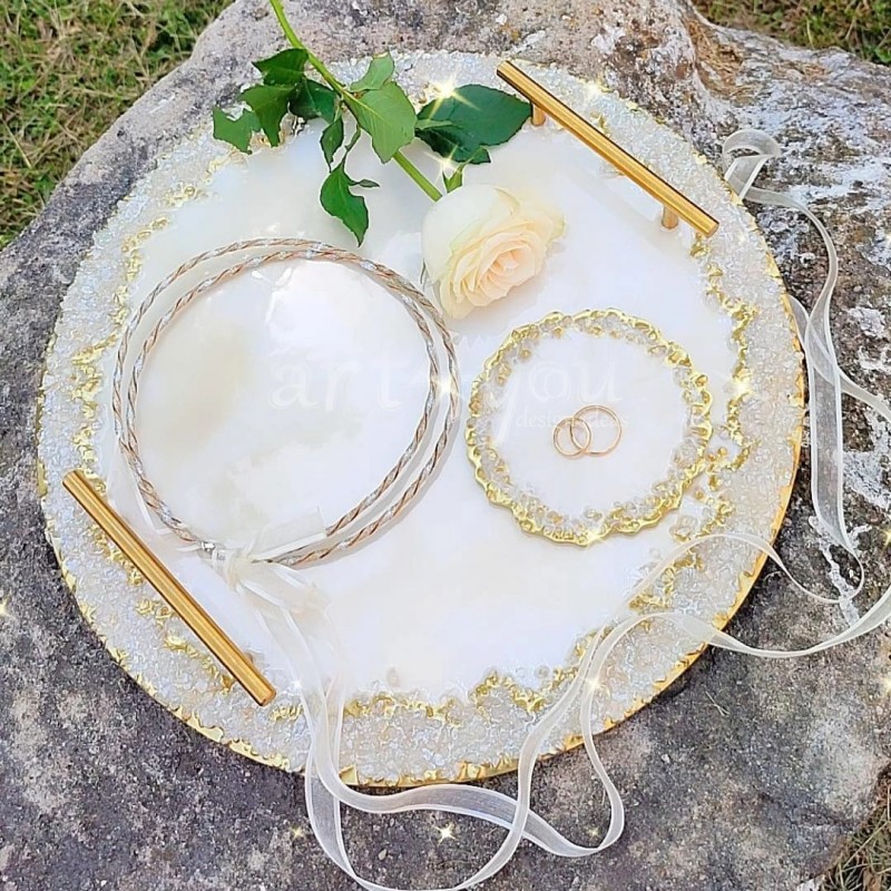 Δεν περιλαμβάνονται τα στέφανα και βέρες. Ο δίσκος είναι χειροποίητος.