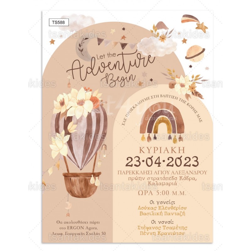 Προσκλητήριο βάπτισης για κορίτσι με θέμα Airballoon and Rainbow