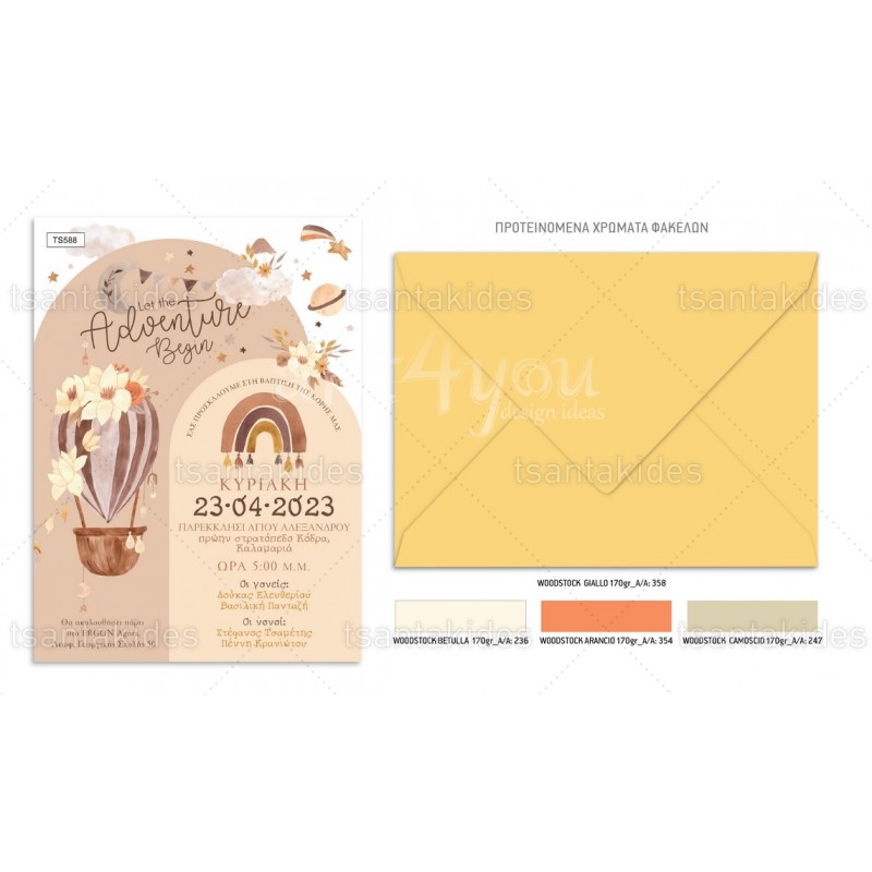 Το προσκλητήριο διαθέτει φάκελο διάστασης 19,5x14,5cm σε χαρτί της επιλογής σας από τους αναγραφόμενους κωδικούς.