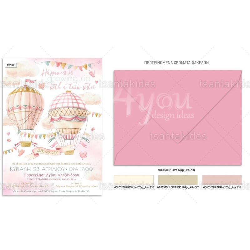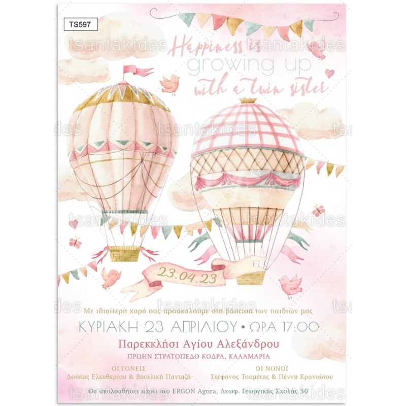 Προσκλητήριο βάπτισης για δίδυμα Baby Girls Hot Air Balloon