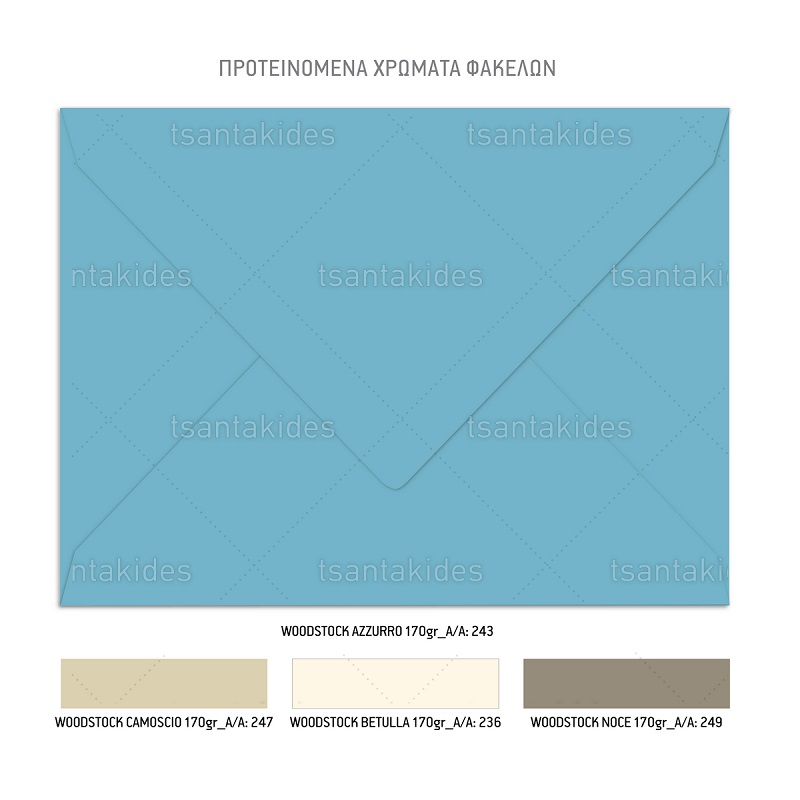 Το προσκλητήριο διαθέτει φάκελο διάστασης 19,5x14,5cm σε χαρτί της επιλογής σας από τους αναγραφόμενους κωδικούς.