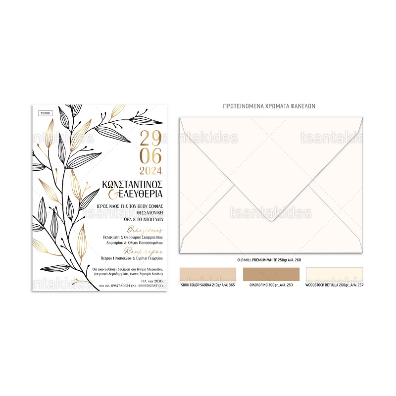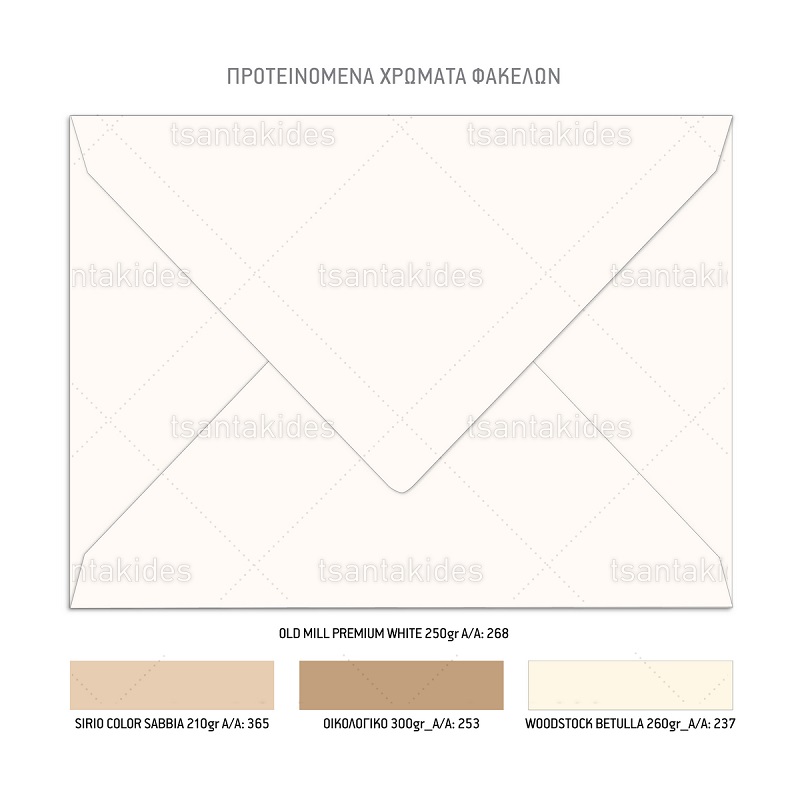 Το προσκλητήριο διαθέτει φάκελο διάστασης 16x22cm σε χαρτί της επιλογής σας από τους αναγραφόμενους κωδικούς.