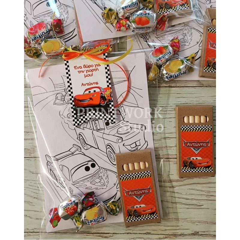 σετ ξυλομπογιές ή κηρομπογιές με αυτοκόλλητο και 2 καραμέλες ζελεδάκια μέσα σε σακουλάκι και κορδελάκι.