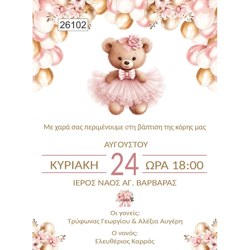 Οικονομικό προσκλητήριο Ροζ Αρκουδάκι Μπαλαρίνα με μπαλόνια